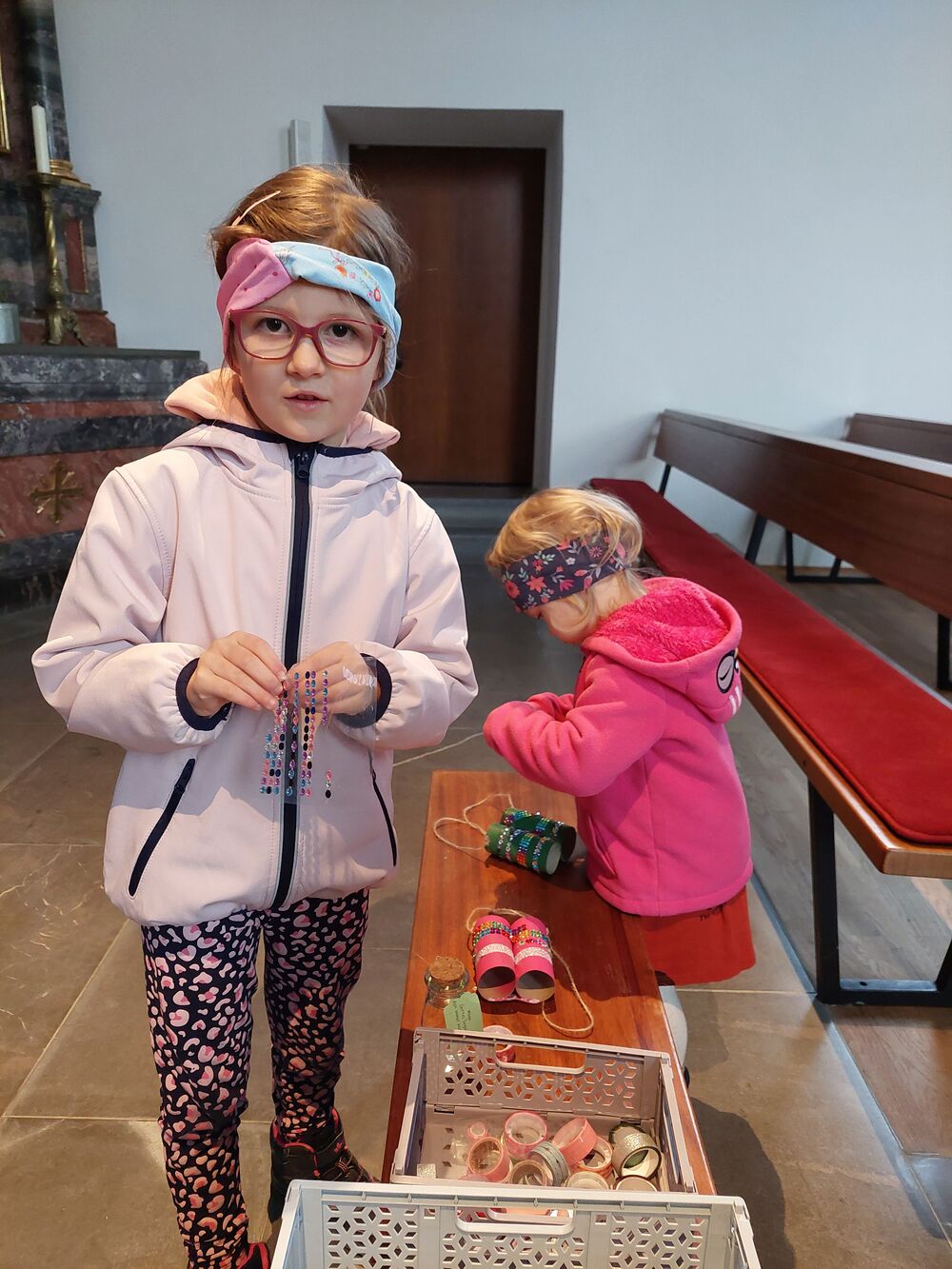 Ein Blick durch das selbstgebastelte Fernrohr und dann ging es los auf Entdeckungstour durch die Kirche. In Gruppen besuchten die Kinder die verschiedensten Stationen. Die Sakristei wurde von Dietmar Hirschbühl erklärt, Pfarrer Ratz ließ die Augen beim neuen Taufbecken, der Osterkerze sowie dem Altar strahlen. Sandra stimmte mit den Kindern die Orgel an und mit Anna wurden bei den Opferkerzen Wünsche zu Gott gesendet und den Beichtstuhl begutachtet. Zum Abschluss durften die Erstkommunionskinder noch den Kirchturm erklimmen.